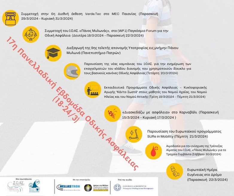 Από τις 18-24 Μαρτίου γίνεται η Πανελλαδική Εβδομάδα Οδικής Ασφάλειας που τελεί υπό την Αιγίδα του Υπουργείου Υποδομών και Μεταφορών. Η 17η Πανελλαδική Εβδομάδα Οδικής Ασφάλειας διοργανώνεται για 17η συνεχή χρονιά από το Ινστιτούτο Οδικής Ασφάλειας (Ι.Ο.ΑΣ.) «Πάνος Μυλωνάς» σε συνεργασία με το Σύλλογο Ελλήνων Συγκοινωνιολόγων (ΣΕΣ). Οι εκδηλώσεις έχουν την υποστήριξη του φορέα «ΕΛΛΗΝΙΚΕΣ ΥΠΟΔΟΜΕΣ και ΟΔΟΙ ΜΕ ΔΙΟΔΙΑ» με διακριτικό τίτλο «HELLASTRON», της Συμμαχίας για την Ασφάλεια και τον Πολιτισμό στο Δρόμο «Δρόμοι στο Μέλλον» και τη στήριξη πλήθους άλλων φορέων και Οργανώσεων.
