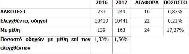 Σε σύνολο 10.441 ελέγχων σε έναν μήνα βρέθηκαν 163 να έχουν καταναλώσει αλκοόλ, νούμερο που και αυτό ήταν αυξημένο σε σχέση με τον Απρίλιο του 2016 και συγκεκριμένα σε ποσοστό 17,27%.