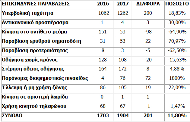 Στο σύνολο των επικίνδυνων παραβάσεων, όπως υπερβολική ταχύτητα, κίνηση στο αντίθετο ρεύμα, Πολλές από αυτές τις παραβάσεις είναι δολοφονικέςπαράβαση ερυθρού σηματοδότη, οδήγηση χωρίς κράνος – ζώνη, χρήση κινητού τηλεφώνου, υπήρξε αύξηση της τάξεως του 11,80%.