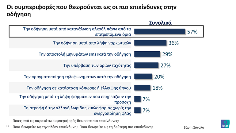 Όπως συμβαίνει κατά μέσο όρο και στην Ευρώπη, πάνω από 1 στους 4 Έλληνες είχαν την εντύπωση ότι έχουν αποκοιμηθεί μερικά δευτερόλεπτα στο τιμόνι. Ακόμα, η υπνηλία κατά την οδήγηση βρίσκεται στη 2η θέση (34% των απαντήσεων) όσον αφορά στις πρωταρχικές αιτίες θανατηφόρων τροχαίων, μετά την ταχύτητα (56%) και πριν από την οδήγηση υπό την επήρεια αλκοόλ και ναρκωτικών ουσιών (25%). Το εν λόγω αποτέλεσμα είναι ίδιο με τον ευρωπαϊκό μέσο όρο. Μόνο οι Γάλλοι, οι Βρετανοί και οι Πολωνοί οδηγοί θεωρούν την υπνηλία κατά την οδήγηση ως την 1η αιτία θανατηφόρων τροχαίων.