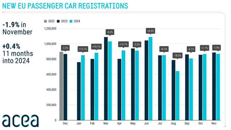 Σε ολόκληρη την Ευρωπαϊκή Ένωση, οι πωλήσεις νέων οχημάτων μειώθηκαν κατά 1,9% τον Νοέμβριο σε περίπου 1,06 εκατομμύρια μονάδες. Αυτό οφειλόταν εν μέρει στην απότομη μείωση των πωλήσεων κατά 12,7% στη Γαλλία σε συνδυασμό με την πτώση κατά 10,8% στην Ιταλία. Οι πωλήσεις στη Γερμανία παρέμειναν στάσιμες, σημειώνοντας αύξηση μόλις κατά 0,5%. Η Ισπανία ήταν η μόνη από τις τέσσερις μεγαλύτερες αγορές της ΕΕ που σημείωσε αύξηση των πωλήσεων, η οποία καταγράφηκε στο 6,4%.