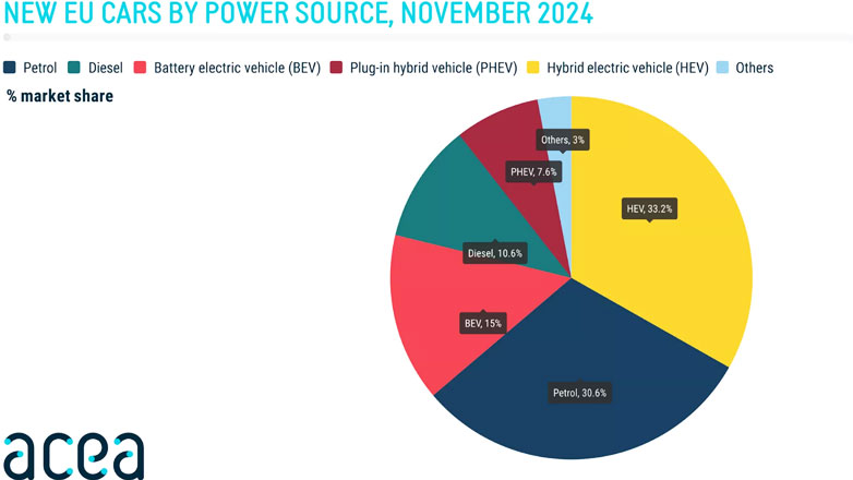 Τα παραδοσιακά υβριδικά οχήματα είναι πλέον η πιο δημοφιλής επιλογή κίνησης στην Ε.Ε. αντιπροσωπεύοντας το 33,2% του συνόλου των νέων πωλήσεων. Αυτό είναι αυξημένο από το 27,5% του μεριδίου αγοράς τον περασμένο Νοέμβριο, που αντιστοιχεί σε αύξηση 18,5%. Τα βενζινοκίνητα αυτοκίνητα εκτοπίστηκαν από την πρώτη θέση και ενώ πέρυσι αντιπροσώπευαν το 32,5% των πωλήσεων, το ποσοστό αυτό έχει πλέον υποχωρήσει στο 30,6% του μεριδίου αγοράς.