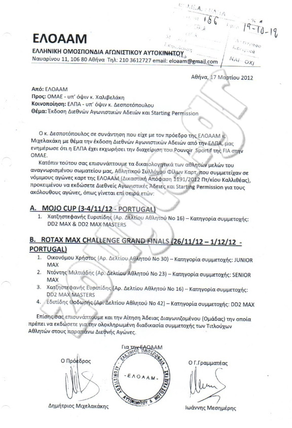 τέσσερις αθλητές που έχουν προκριθεί για να συμμετάσχουν στον παγκόσμιο τελικό Rotax Max challenge στην Πορτογαλία. «Κάποιοι στην ΕΛΠΑ λειτουργούν μάλλον με δόλο. Δεν μπορώ να καταλάβω γιατί υπάρχει μία τόσο μεγάλη καθυστέρηση στην έκδοση αγωνιστικών αδειών. Έχουμε ζητήσει επίσημα να μας εκδώσουν άδειες τις οποίες έπρεπε να τις πάρουμε την ίδια στιγμή και αυτοί απλά δεν κάνουν τίποτα. Δεν μπορώ να καταλάβω το γιατί. Μάλλον το κάνουν για αντίποινα επειδή φέτος τρέχαμε σε αγώνες με την έγκριση της υπό έγκρισης ομοσπονδίας ΕΛΟΑΑΜ και όχι με την ΕΛΠΑ. Αυτά τα πράγματα μας γυρίζουν πολλά χρόνια πίσω».