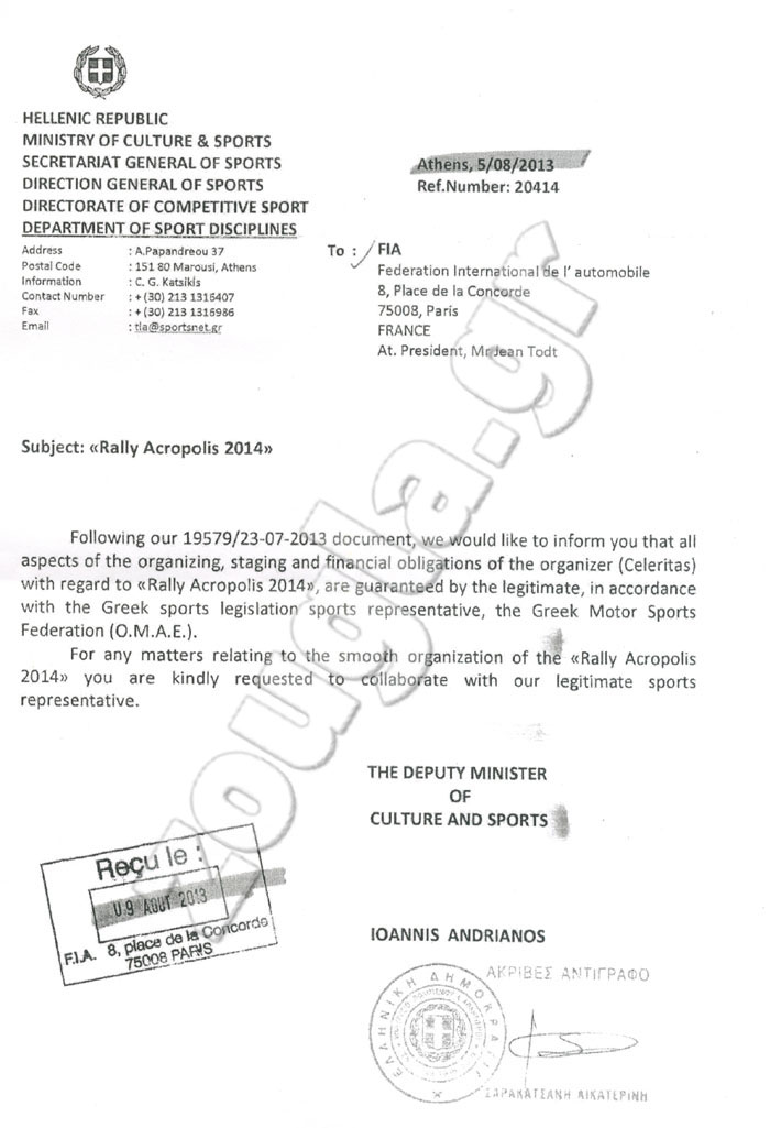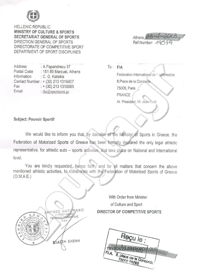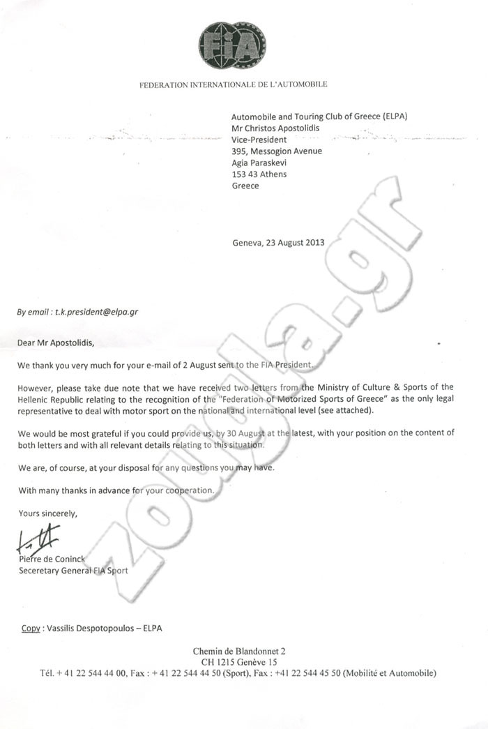 Η πρώτη επιστολή που απέστειλε στη FIA ο προιστάμενος της διεύθυνσης της Γενικής Γραμματείας Αθλητισμού Τρύφων Ζαχαρόπουλος που ενημερώνει ότι εκπρόσωπος της Ελλάδος είναι η ομοσπονδία.