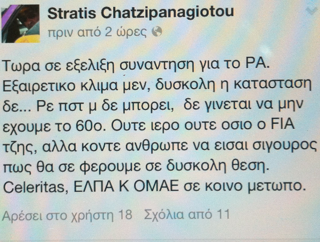 ξεκάθαρος: «Εμείς ενημερώσαμε την FIA ότι υπάρχουμε σαν ομοσπονδία και εάν έχετε οποιοδήποτε πρόβλημα με την Ελλάδα θα αναλάβουμε εμείς. Η Γενική Γραμματεία δεν αναγνωρίζει καμία ΕΛΠΑ. Ούτε το όνομά της δεν θέλει να ακούει… Από τη στιγμή που θα μας δώσουν (σ.σ. οι της ΕΛΠΑ) το Pouvoir Sportif θα σας πληρώνουμε κανονικά. Όσον αφορά το ράλι Ακρόπολις πράγματι υπάρχει περίπτωση να μην γίνει. Αν οι αγώνες δεν γίνουν 14 (σ.σ. από 13) και μπει η Πολωνία δεν θα έχουμε αγώνα. Θα βγει απ’ έξω (σ.σ. το Ακρόπολις) επειδή χρωστούν χρήματα εδώ και τρία χρόνια. Το επισήμανε και ο Τοντ (σ.σ. πρόεδρος της FIA) τόσες φορές. Η ΕΛΠΑ θα πρέπει να συνεργαστεί και να πληρώνει της υποχρεώσεις της».