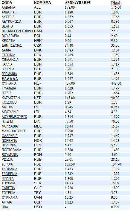 Στη χώρα μας οι τιμές των καυσίμων εξακολουθούν να κινούνται ανοδικά με την μέση τιμή της βενζίνης 95 οκτανίων να αγγίζει το 1.657 €/λίτρο και το πετρέλαιο κίνησης το 1.494 €/λ. Ανάλογη εικόνα επικρατεί και στις άλλες χώρες της Ευρώπης, όπως αναφέρεται στο Δελτίο Τιμών Καυσίμων της ΕΛΠΑ. Με βάση τη δειγματοληψία αυτή, οι υψηλότερες τιμές αμόλυβδης βενζίνης (με αριθμό οκτανίου 95) σημειώθηκαν στις χώρες: Ολλανδία: 1,747 €/λ, Iταλία: 1,702 €/λ, Ελλάδα: 1,657 €/λ, Βέλγιο: 1,653 €/λ, Φινλανδία: 1,571€/λ, Πορτογαλία : 1,588 €/λ, Γερμανία: 1,549 €/λ, Ιρλανδία: 1529 €/λ κα, ενώ οι χαμηλότερες στο Κόσσοβο : 1,29 €/λ, το Λουξεμβούργο:1,314 €/λ, το Μαυροβούνιο: 1,29 €/λ, την Ισπανία: 1,30 €/λ, την Αυστρία: 1,2352 €/λ, την Σλοβενία: 1,342 €/λ κ.ά.
