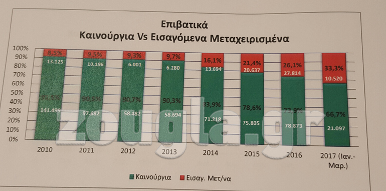 Ένα στα 3 αυτοκίνητα που πουλήθηκαν το πρώτο τρίμηνο ήταν εισαγόμενα μεταχειρισμέναμεταχειρισμένων), ενώ το 2016 το νούμερο αυτό έφτασε ήταν 27.814 με 26.1% μερίδιο. Φαίνεται ξεκάθαρα πως το mix έχει αλλάξει σημαντικά, ενώ έχει αυξηθεί ακόμα περισσότερο το πρώτο τρίμηνο του 2017 όπου το μερίδιο άγγιξε το 33.3%.