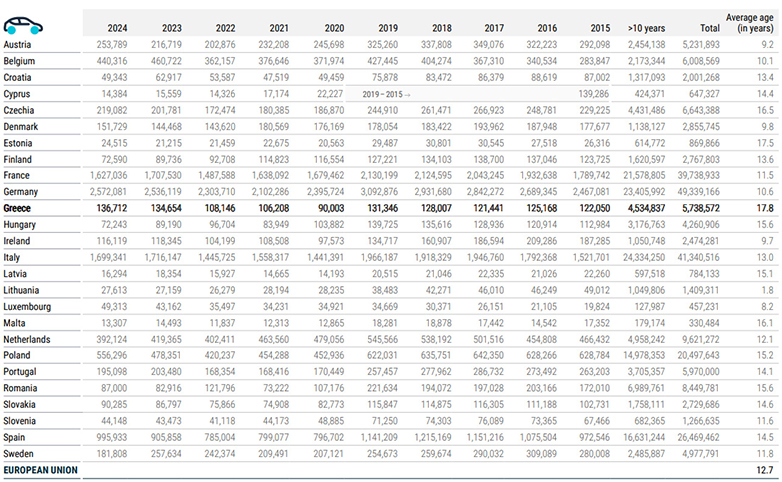 Σύμφωνα με την έκθεση «Vehicles on European Roads 2026» (βάσει στοιχείων 2024), ο μέσος όρος ηλικίας των Ι.Χ. αυτοκινήτων στην Ελλάδα φτάνει τα 17,8 χρόνια, πολύ υψηλότερα από τον ευρωπαϊκό μέσο όρο των μόλις 12,7 χρόνια. Μάλιστα να θυμίσουμε πως και για το 2023, η Ελλάδα είχε τον πιο “γερασμένο” στόλο με μ.ο. τα 17.5 χρόνια (όπως και τα τρία προηγούμενα χρόνια)