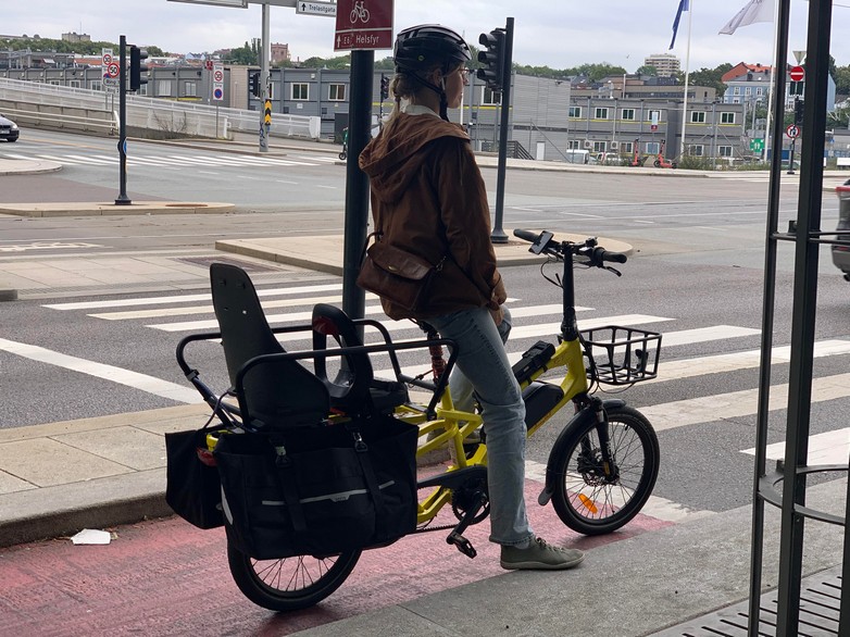 Η κυρία που βλέπετε είναι μια νεαρή μητέρα στο Αμβούργο. Κινείται με το ποδήλατο, φοράει κράνος και περιμένει στο φανάρι να ανοίξει το πράσινο.