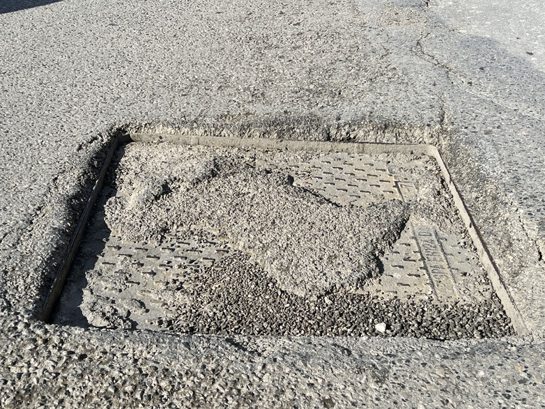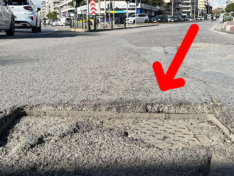 Όπως βλέπετε υπάρχει ένα φρεάτιο. Είναι φτιαγμένο πρόσφατα. Στη φωτογραφία μπορεί να μη φαίνεται ακριβώς πόσα εκατοστά είναι η διαφορά ανάμεσα σε άσφαλτο και φρεάτιο.