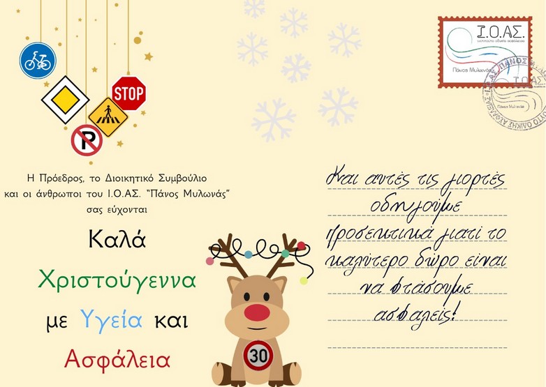 Μαζί με την ευχετήρια κάρτα το Ινστιτούτο Οδικής Ασφάλειας ( Ι.Ο.Α.Σ ) « Πάνος Μυλωνάς» δίνει τις απαραίτητες συμβουλές για τους εξοδούχους.