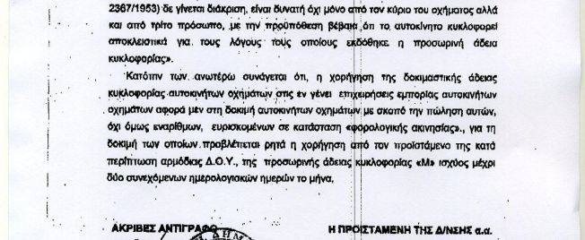 Μάλιστα στο έγγραφο απάντηση του υπουργείου Οικονομικών προς το ΣΕΕΑΕ μνομονεύεται και η διάταξη νόμου του 1953 που υπογράφει ο Βασιλεύς Παύλος (διάταξη 23 του νόμου 2367/1953) βάσει της οποίας οι κατασκευαστές, έμποροι και οι εν γένει αντιπρόσωποι πώλησης αυτοκινήτων οχημάτων δικαιούνται να κυκλοφορήσουν αποκλειστικά για δοκιμή τα προς πώληση αυτοκίνητα αφού καταβάλλουν τα νόμιμα Ετήσια Τέλη Κυκλοφορίας.