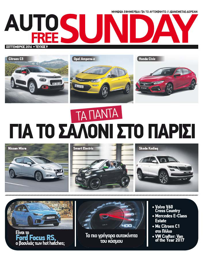 To 9o τεύχος της Auto Free Sunday ήδη διανέμεται, με αφιέρωμα στα σημαντικότερα μοντέλα που παρουσιάστηκαν στο Σαλόνι του Παρισιού. Την αποκλειστική επιμέλεια της εφημερίδας Auto Free Sunday, όπως και της σχετικής στήλης στην εφημερίδα Free Sunday, έχουν οι Νίκος Μαρινόπουλος και Γιάννης Σκουφής.