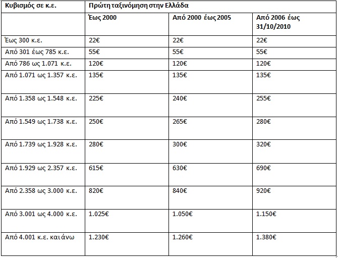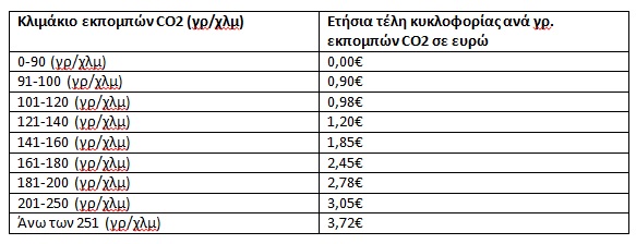 Αξίζει να σημειώσουμε πως τα αυτοκίνητα με άδεια κυκλοφορίας από 1/1/2010 επιβαρύνονται με βάσει τις εκπομπές ρύπων C02 σε αντίθεση με τα παλαιότερα από την συγκεκριμένη ημερομηνία που επιβαρύνονται με βάσει τον κυβισμό.