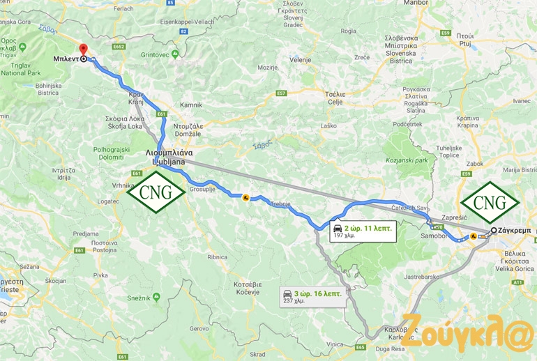 Γεμίζουμε φυσικό αέριο στο μοναδικό πρατήριο του Ζάγκρεμπ (με 13 ευρώ) και έπειτα από 2,5 ώρες και 200 χιλιόμετρα φτάνουμε στη βόρεια Σλοβενία, στην καταπληκτική λίμνη Μπλεντ. Από εκεί, αρχίζουμε την κάθοδο και επιστρέφουμε στη Λουμπλιάνα. Το δίκτυο πρατηρίων της Σλοβενίας είναι σχετικά μικρό (5 πρατήρια) και εμείς ανεφοδιάζουμε με αυτόματο, για πρώτη φορά, πωλητή στη Λουμπλιάνα, όπου η τιμή είναι 1,1 ευρώ το κιλό (12 ευρώ).
