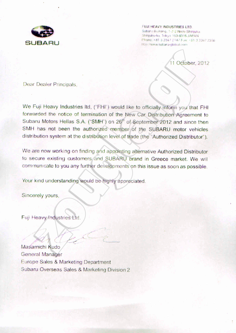 Στο έγγραφο που δημοσιεύουμε παρακάτω και το οποίο υπογράφεται από τον γενικό διευθυντή της εταιρείας στην Ευρώπη, Masamichi Kudo, αναφέρεται επίσης ότι εξετάζεται και η εύρεση εναλλακτικού διανομέα, προκειμένου να διασφαλιστούν οι κάτοχοι οχημάτων Subaru στην Ελλάδα αλλά και η ίδια η μάρκα.