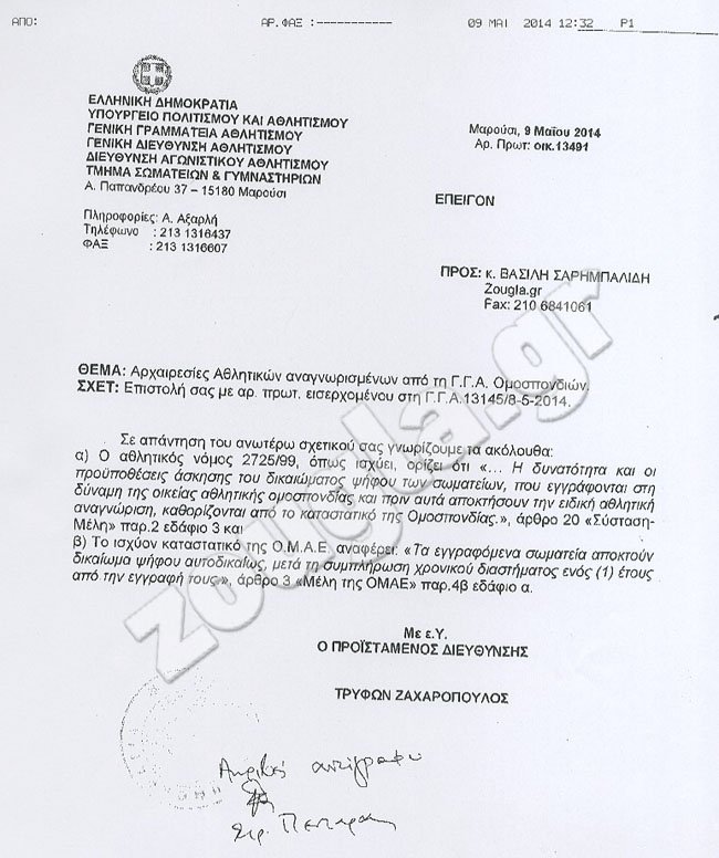 Το zougla.gr θέλοντας να δώσει απάντηση σε όσα συμβαίνουν δημοσιεύει σήμερα, το τι ακριβώς ισχύει με επίσημο έγγραφο της Γενικής Γραμματείας Αθλητισμού. Σύμφωνα με αυτό, δικαίωμα ψήφου έχουν όλες οι λέσχες – σωματεία αρκεί να έχουν συμπληρώσει ένα χρόνο από την εγγραφή του στην ομοσπονδία.