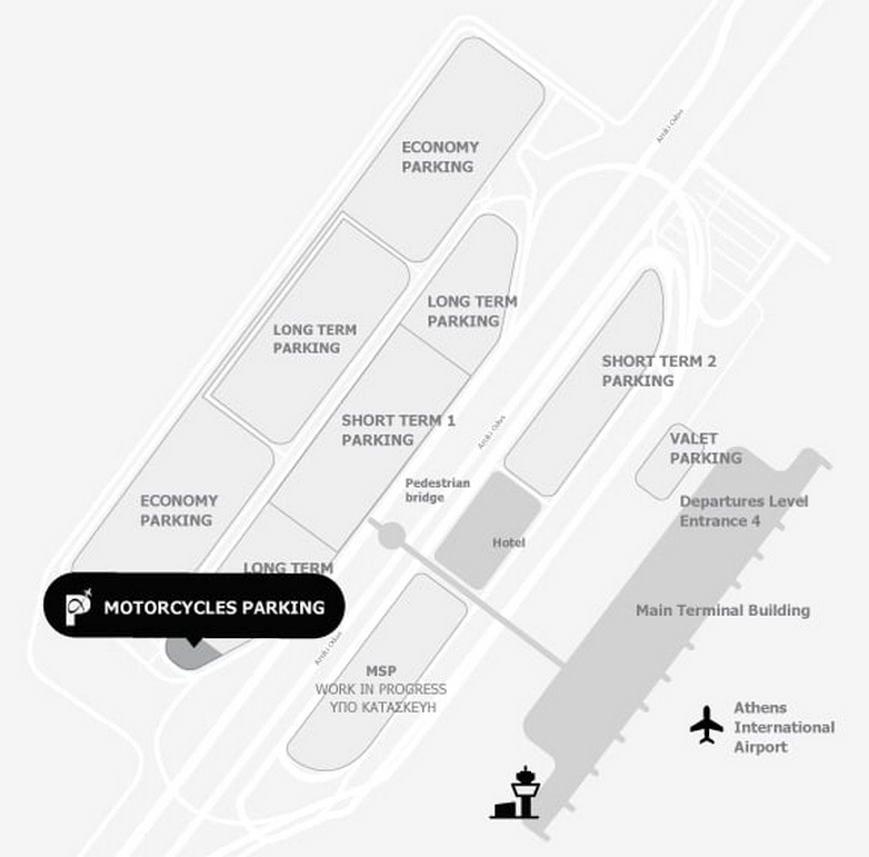 Οι χώροι στάθμευσης μοτοσικλετών στο Μικρής Διάρκειας 1 (Short Term) και στον εξωτερικό χώρο ΔΕΝ είναι διαθέσιμες από τις 3 Ιουλίου 2025. Οι μοτοσικλέτες θα μπορούν να σταθμεύουν δωρεάν στον νέο ειδικά διαμορφωμένο χώρο εντός του πάρκινγκ Μακράς Διάρκειας (Long Term), με ξεχωριστή είσοδο για εύκολη πρόσβαση.