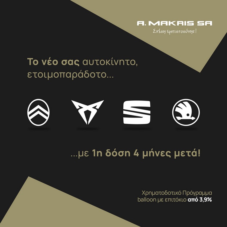 Η Α. ΜΑΚΡΗΣ ΑΕ, παρουσιάζει ένα νέο, ευέλικτο χρηματοδοτικό πρόγραμμα, διαμορφωμένο για την έξυπνη απόκτηση του επόμενού σας αυτοκινήτου. Οι πελάτες θα μπορούν να πληρώσουν την 1η δόση τέσσερις μήνες μετά την αγορά του αυτοκινήτου και με προνομιακά επιτόκια που ξεκινούν από 3,9% με χρηματοδότηση τύπου balloon. H προσφορά ισχύει για παραγγελίες που θα πραγματοποιηθούν έως 15 Νοεμβρίου και για όλα τα νέα μοντέλα Citroen, Cupra, Seat και Skoda.