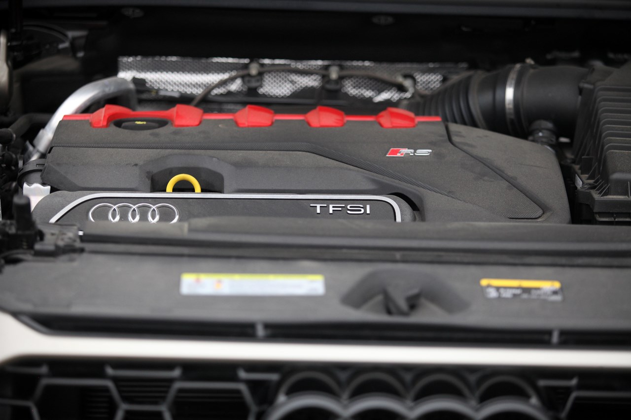 Αρκεί να ανοίξεις το καπό και τα «κόκκινα» σημάδια, σε ενημερώνουν ότι το «αγριεμένο μοτεράκι» με το αλουμινένιο μπλοκ διαφέρει από τα άλλα της σειράς Q3.Ο συγκεκριμένος βενζινοκινητήρας τούρμπο είναι 5κύλινδρος TFSI, 2.480 cc, i5, 20v, 2 ΕΕΚ, με άμεσο και έμμεσο ψεκασμό, μεταβλητό χρονισμό βαλβίδων και βύθισμα στην εξαγωγή. Πολλές λεπτομέρειες για έναν ιδιώτη.