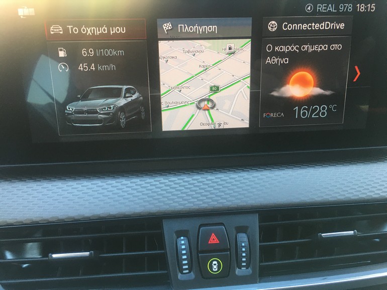Ο οδηγός όλες τις λειτουργίες με τα βοηθήματα τις χειρίζεται από τη μεγάλη οθόνη που βρίσκεται στο κέντρο του εσωτερικού του αυτοκινήτου. Ψηλά,μπροστά στον ουρανό υπάρχει το κουμπί για κλήση έκτακτης ανάγκης,υπηρεσίες Connected Drive και teleservices.