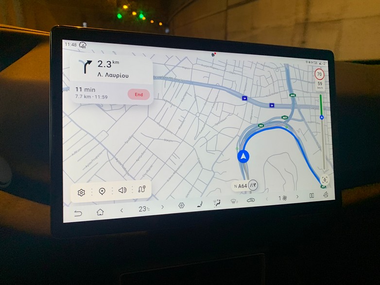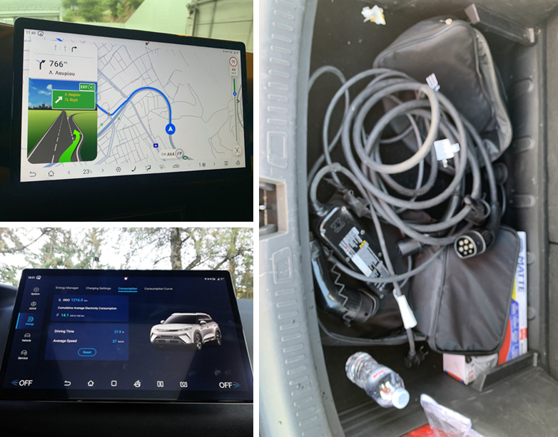 Ξεκινήσαμε τις βόλτες αρχικά στο κέντρο της πόλης και στη συνέχεια βρεθήκαμε έως το Σούνιο. Στις διαδρομές παραλία- Σύνταγμα κάναμε περίπου 80 χιλιόμετρα και στη συνέχεια μέχρι Σούνιο και επιστροφή (60+60 χλμ). Γράφοντας σε σύνολο 200 χιλιόμετρα το υπόλοιπο των χιλιομέτρων που μας έδειχνε ο υπολογιστής ήταν 73 χιλιόμετρα. Κανονικά το υπόλοιπο έπρεπε να ήταν 110 χιλιόμετρα αν κάναμε τους υπολογισμούς με βάση την αυτονομία του. Είχαμε μια διαφορά 37 χιλιομέτρων. ‘Όμως θα πρέπει να μετρήσουμε ότι κάναμε σκόπιμα πέντε φορές γρήγορες εκκινήσεις για να δούμε αν τα 0-100 χλμ μπορούμε να τα πετύχουμε σε 7.9 δευτερόλεπτα που δίνει η BYD. Και στη διαδρομή για το Σούνιο σε δύο τρία σημεία που μπορούσαμε να κινηθούμε λίγο πιο πάνω από το όριο δοκιμάσαμε να πλησιάσουμε τα 160 χλμ (είναι η τελική ταχύτητα που δίνει η εταιρία).