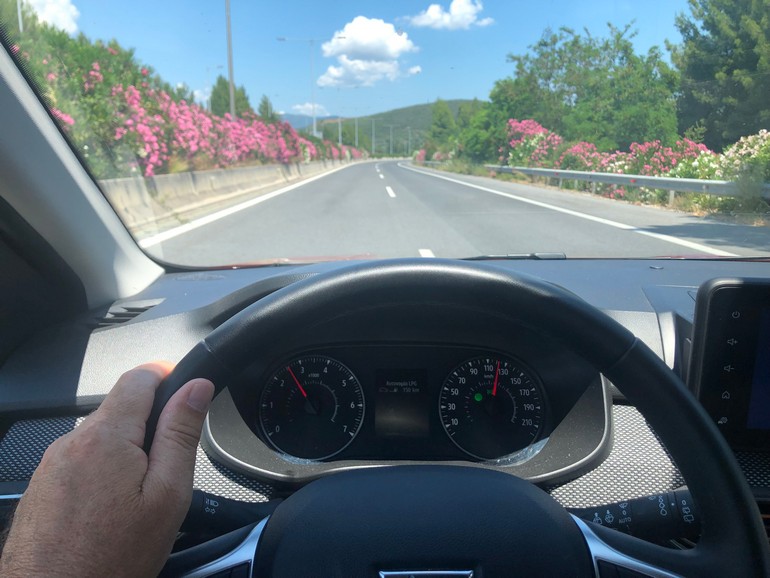 Ξεκινήσαμε από Αθήνα για τα σύνορα της Νίκης. Η συνδυαστική αυτονομία με γεμάτο το ρεζερβουάρ βενζίνης (50 λίτρα χωρητικότητα) και τη δεξαμενή αποθήκευσης του υγραερίου κίνησης (40 λίτρα χωρητικότητα) , μπορεί να φθάσει τα 1150 χλμ. χωρίς στάση. Δηλαδή 350 χιλιόμετρα LPG και με βενζίνη άλλα 800 χιλιόμετρα. Ωστόσο ο σκοπός μας ήταν να κινηθούμε μόνο με το λαμπάκι αναμμένο στο LPG.