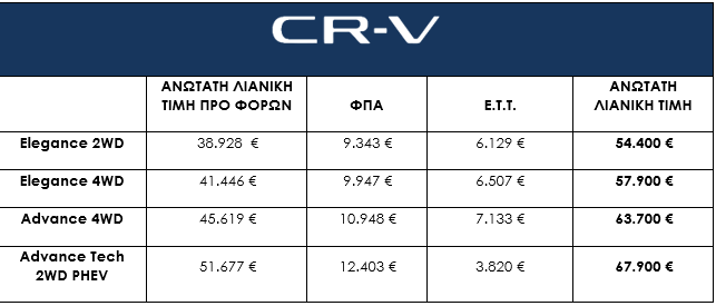 Η έκτη γενιά Honda CR-V  διαθέτει υβριδικό και plug-in υβριδικό σύστημα μετάδοσης κίνησης, που είναι ο τέλειος συνδυασμός δυναμικών επιδόσεων και αποδοτικότητας καυσίμου. Τα νέα βοηθήματα οδήγησης και οι λειτουργίες του Honda SENSING εξασφαλίζουν κορυφαία ενεργητική και παθητική ασφάλεια. Κάθε πτυχή του νέου CR-V έχει βελτιωθεί, προσφέροντας το τέλειο μείγμα δυναμικού χαρακτήρα, άνεσης και πολυτέλειας.