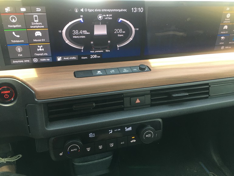 Να επιστρέψουμε όμως στο Honda e. Σχεδιαστικά εξωτερικά και εσωτερικά μας άρεσε. Πρωτοποριακός –για την κατηγορία του – είναι και ο πίνακας οργάνων. Οι πέντε έγχρωμες οθόνες υψηλής ανάλυσης δίνουν άλλο προφίλ στο εσωτερικό. Ξεχωρίζει ο ψηφιακός πίνακας 8,8” και οι δύο οθόνες 12,3”.