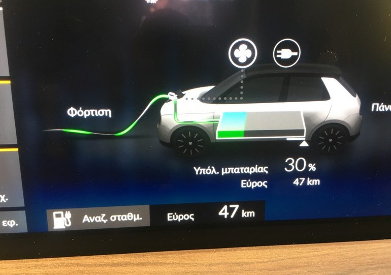 Μας προβλημάτισε η αυτονομία. Όταν ξεκινήσαμε από τη λεωφόρο Αθηνών όπου βρίσκονται οι εγκαταστάσεις της εταιρίας Σαρακάκη που αντιπροσωπεύει στη χώρα μας τα γιαπωνέζικα Honda, η αυτονομία του Honda e έγραφε 210 χιλιόμετρα.