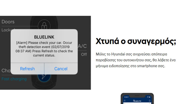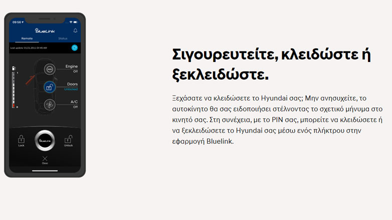 Με την εφαρμογή Bluelink δεν πρόκειται να μείνεις ποτέ από καύσιμο (είτε βενζίνη είτε ρεύμα), ενώ παράλληλα μπορείς ανά πάσα στιγμή να ελέγξεις ότι το αυτοκίνητο σου είναι εκεί που το πάρκαρες, αλλά και να σιγουρευτείς ότι το κλείδωσες. Με πιο απλά λόγια, η εφαρμογή Bluelink που είναι στάνταρ σε όλα τα νέα μοντέλα, παίρνει από τον οδηγό όλο το άγχος κατοχής ενός οχήματος και του προσφέρει το απόλυτο, εξ αποστάσεως εργαλείο.