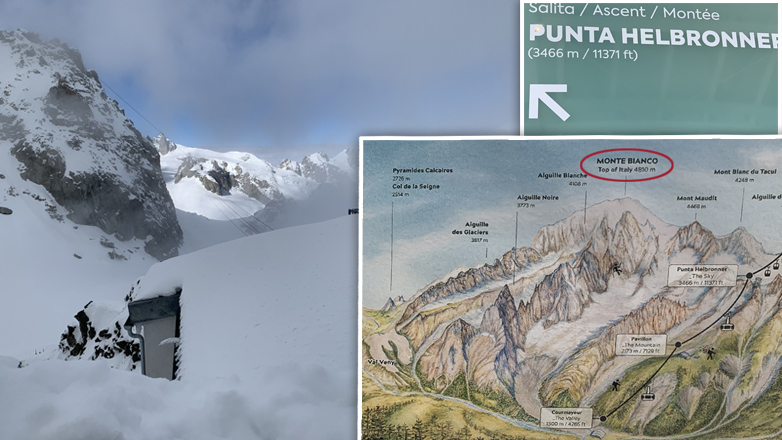 Λίγο πιο πάνω από την Punta Helbronner υπήρχε το σημείο συνάντησης των αλπινιστών, το Monte Bianco στα 4.806 μέτρα. Είναι το ψηλότερο σημείο στις ιταλικές Άλπεις. Φυσικά για να φθάσεις μέχρι εκεί πρέπει να είσαι άριστος αλπινιστής, να φοράς ειδικά ρούχα και να έχεις μάσκα με οξυγόνο.