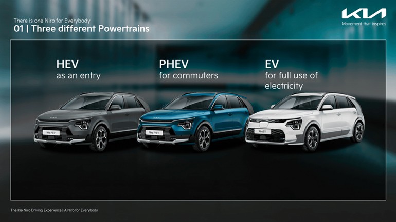 Στην παρουσίαση δέσποζε το σλόγκαν: «Υπάρχει ένα Niro για τον καθένα» . Και ποιο ήταν το μήνυμα; Ότι στο νέο Crossover Utility Vehicle της Kia μπορείς να βρεις αυτό που ζητάς. Στην παρουσίαση υπήρχαν το Niro σε full hybrid (HEV), το Niro σε plug-in hybrid (PHEV) και το Niro σε αμιγώς ηλεκτρική (EV) έκδοση.