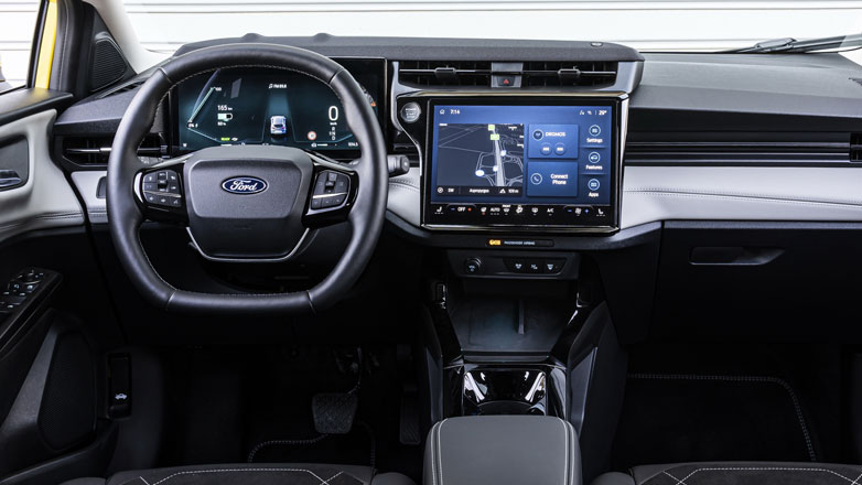 Το ψηφιακό κόκπιτ είναι κοινό με το θερμικό Puma, συμπεριλαμβανομένου του ψηφιακού πίνακα οργάνων 12,8 ιντσών και της οθόνης αφής 12 ιντσών του συστήματος infotainment SYNC4. Ωστόσο, η ηλεκτρική έκδοση διαθέτει μια υπερυψωμένη κεντρική κονσόλα με έναν νέο αποθηκευτικό χώρο που εκμεταλλεύεται τον χώρο που κανονικά καταλαμβάνει το κιβώτιο ταχυτήτων. Είναι ξεκάθαρο πως η συναρμογή των υλικών είναι εξαιρετική, με πολλές μικρές πινελιές που θα τις ανακαλύπτετε όσο θα περνάτε ώρες εντός του.