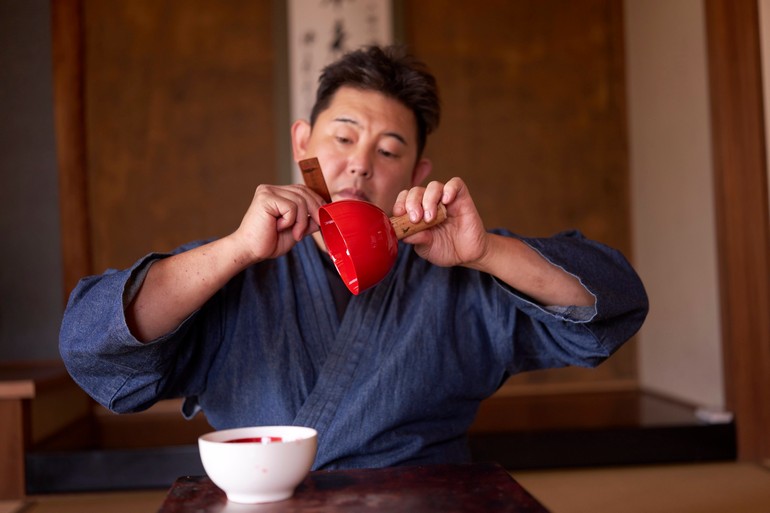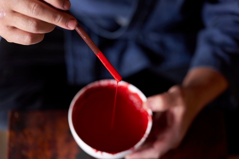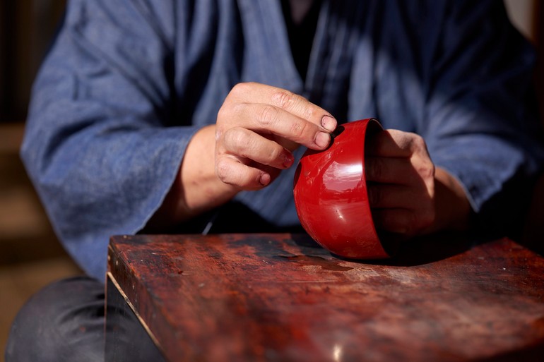 Ο βραβευμένος καλλιτέχνης Naoya Takayama από τη Χιροσίμα είναι διακεκριμένος για την επιδέξια εκδοχή του στην τεχνική Akebono-Nuri, όπου δημιουργεί μαύρες και κόκκινες διαβαθμίσεις σε πολλά στρώματα, προσθέτοντας βάθος στη διακόσμηση.