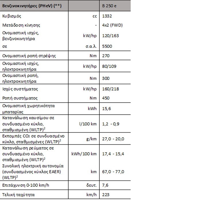 Τα υβριδικά plug-in μοντέλα της ανανεωμένης B-Class (Mercedes-Benz B 250 e, κατανάλωση καυσίμου σε συνδυασμένο κύκλο 1,2-0,9 l/100 km, ηλεκτρική κατανάλωση σε συνδυασμένο κύκλο 17,4-15,4 kWh/100km, εκπομπές CO2 σε μικτό κύκλο 27-20g/km) εξοπλίζονται με μία βελτιωμένη μπαταρία υψηλής τάσης.