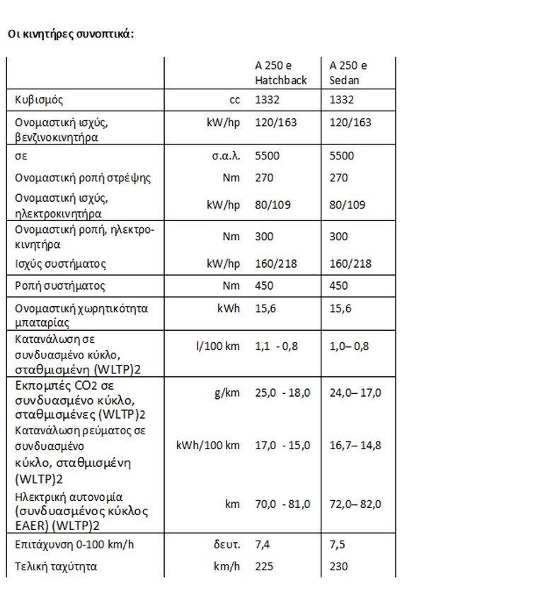 Mercedes-Benz A 250 e Sedan: Σταθμισμένη κατανάλωση καυσίμου σε συνδυασμένο κύκλο (WLTP) 1,0-0,8 l/100 km, σταθμισμένη ηλεκτρική κατανάλωση σε συνδυασμένο κύκλο (WLTP) 16,7-14,8 kWh/100km, σταθμισμένες εκπομπές CO2 σε συνδυασμένο κύκλο (WLTP) 24-17 g/km)2. Η μπαταρία υψηλής τάσης βελτιώθηκε και πάλι, με αποτέλεσμα το υψηλότερο ωφέλιμο ενεργειακό περιεχόμενο να προσφέρει αυξημένη ηλεκτρική αυτονομία. Η ισχύς του ηλεκτροκινητήρα έχει αυξηθεί κατά 5 kW αγγίζοντας πλέον τα 80 kW.