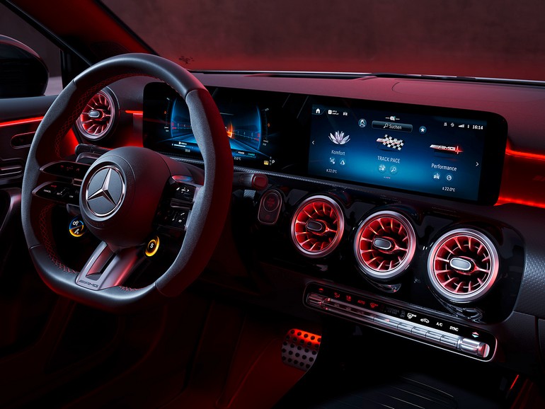 Ο ιδιαίτερος εσωτερικός χώρος με την υψηλή τεχνολογία ξεκινάει ακόμη και από τη βασική έκδοση της νέας A-Class. Θα παρατηρήσετε μπαίνοντας στο εσωτερικό την ανεξάρτητη διπλή οθόνη που βρίσκεται στο επίκεντρο με τη μεγάλη οθόνη οδηγού 10,25 ιντσών και τη δεύτερη μεγάλη οθόνη πολυμέσων 10,25 ιντσών που μοιάζουν να αιωρούνται. Η εσωτερική αρχιτεκτονική, η οποία είναι μοναδική στην κατηγορία, δημιουργεί μία πολυτελή ατμόσφαιρα που θυμίζει τον νυχτερινό φωτισμό ενός φουτουριστικού κτιρίου.