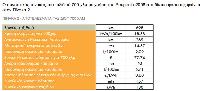 Ο συνοπτικός πίνακας του ταξιδιού 700 χλμ με χρήση του Peugeot e2008 στο δίκτυο φόρτισης φαίνεται στον Πίνακα 2.