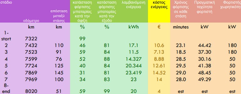 Η οδηγική εμπειρία είναι με τον δικό της τρόπο θεαματική στην Ελλάδα δεδομένης της ποσότητας αιολικής και ηλιακής ενέργειας επί του παρόντος στο ηλεκτρικό δίκτυο. Οι εθνικοί αυτοκινητόδρομοι επενδύουν επίσης στη φόρτιση αυτοκινήτων με ηλιακή ενέργεια, η οποία χρησιμοποιήθηκε σε αυτό το ταξίδι στη στάση 7 (βλ. Πίνακα 1).