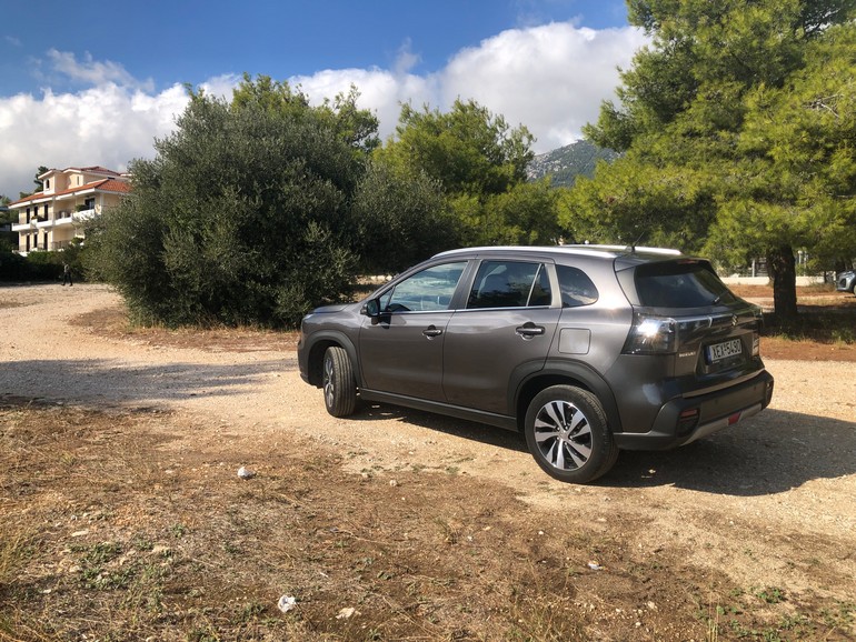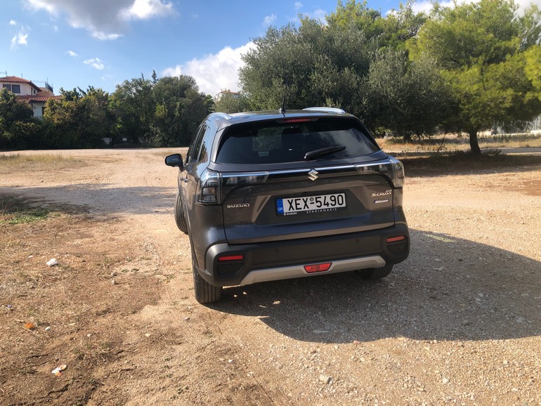 Πριν ξεκινήσουμε τη βόλτα μας να δούμε τις διαστάσεις του αυτοκινήτου που το κατατάσσουν στην κατηγορία των συμπαγών SUV. Το μήκος του Suzuki SX4 S-Cross 1.4 Hybrid 48V είναι 4.300 χλστ, το πλάτος 1.785 χλστ. και το ύψος 1.580 χλστ. Το μεταξόνιο είναι 2.600 χλστ . Λογικό είναι με τόσο μεγάλο μεταξόνιο να υπάρχουν άνετοι χώροι όχι μόνο για τους μπροστινούς αλλά και για τους πίσω επιβάτες. Τα γόνατα των πίσω επιβατών σπάνια μπορεί να ακουμπήσουν στα μπροστινά καθίσματα. Μόνο ο τρίτος επιβάτης χάνει λίγο από την άνεση με την παρουσία του κεντρικού τούνελ.