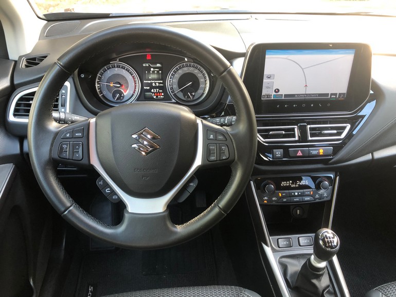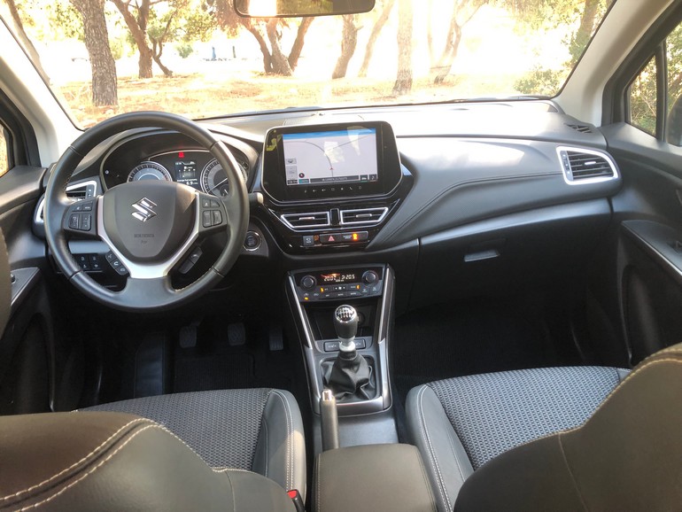 Με την ίδια συντηρητική γραμμή που κινήθηκαν οι σχεδιαστές για την εξωτερική όψη του S-Cross, ακολούθησαν και οι σχεδιαστές στο εσωτερικό του SUV. Απέφυγαν τις εξεζητημένες προτάσεις. Ωστόσο δεν περνάει απαρατήρητη η μεγάλη κεντρική οθόνη αφής των 9 ιντσών. Εδώ έχουμε νέα γραφικά υψηλής ευκρίνειας. Μέσα από αυτή την οθόνη προβάλλεται το ενσωματωμένο σύστημα πλοήγησης αλλά και η ροή ενέργειας του υβριδικού συστήματος.