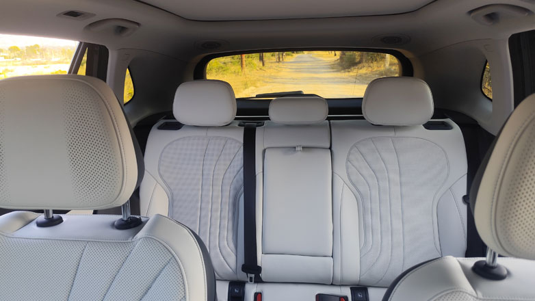 Μπαίνοντας στο εσωτερικό, η ποιότητα και η εικόνα, αυτόματα εξαφανίζουν οποιαδήποτε προκατάληψη για την καταγωγή του. Όλη η εικόνα στο εσωτερικό του EX5 εκπέμπει premium αύρα, με λευκές επενδύσεις από vegan δέρμα, άψογη συναρμογή και φυσικά την τεράστια γυάλινη πανοραμική οροφή που ανοιγοκλείνει ακόμα και με φωνητικές εντολές. Τα περισσότερα υλικά είναι μαλακά, και το φως που μπαίνει στην καμπίνα είναι άπλετο.