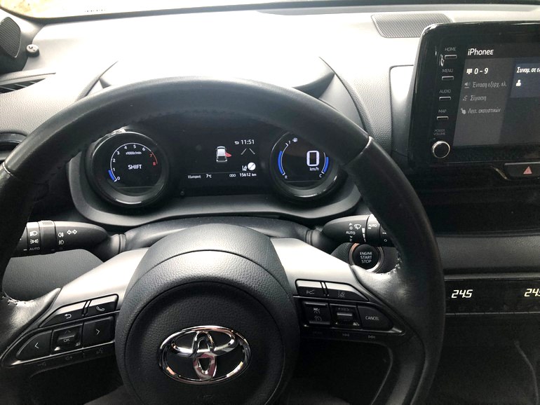 Στο κέντρο του ταμπλό υπάρχει μία μεγάλη οθόνη αφής 8 ιντσών του συστήματος πολυμέσων Toyota Touch. Για να διευκρινίσουμε η οθόνη 8 ιντσών είναι μόνο στην έκδοση της δοκιμής μας γιατί πλέον στην Chic έκδοση, η οποία διατίθεται στο Hybrid, φέρει οθόνη 9.0’’ με standard Navigation.