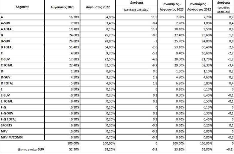 Ας δούμε τώρα και τις προτιμήσεις της αγοράς σε κατηγορίες. Τη μερίδα του λέοντος κέρδισε η B-TOTAL κατηγορία με 51.4%. Στη δεύτερη θέση αλλά με μεγάλη διαφορά έρχεται η B-SUV κατηγορία με 26.8%