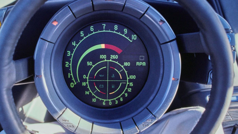 Το υψηλής τεχνολογίας εσωτερικό ήταν ένα πραγματικό στολίδι, με μια οθόνη στην κεντρική κονσόλα που εμφάνιζε πληροφορίες όπως οι δυνάμεις g, η ροπή, η πίεση λαδιού, ακόμα και η πυξίδα. Το τιμόνι χωρίς ακτίνες είναι επίσης ένα αξιοθέατο, υιοθετώντας οθόνη που δείχνει την επιλογή ταχυτήτων, τα χιλιόμετρα και την ταχύτητα στο τεράστιο γυάλινο θόλο.