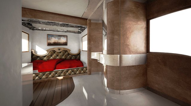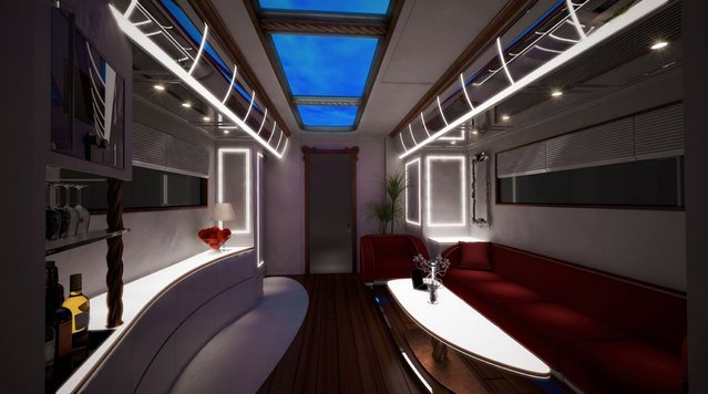 Η κουζίνα είναι ένα μικρό «έργο τέχνης». Η οροφή του οχήματος ανοίγει δίνοντας τη δυνατότητα στους επιβάτες να απολαύσουν τη θέα όπου κι αν βρίσκονται ενώ αρκετά σημεία του τροχόσπιτου έχουν καλυφθεί από φύλλα χρυσού. Το εν λόγω όχημα κατασκευάστηκε για έναν Άραβα από το Ντουμπάι και κοστίζει 3,5 εκατ. ευρώ.