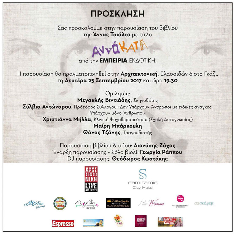Το νέο της βιβλίο με τίτλο «ΑννάΚατα» θα παρουσιάσει την ερχόμενη Δευτέρα η γνωστή δημοσιογράφος και παρουσιάστρια, Άννα Τσιάλτα.