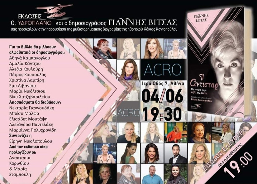 Σε μια βραδιά γεμάτη συγκίνηση και χαρά, το απόγευμα της Τρίτης 4 Ιουνίου στον χώρο «ACRO» (Ιερά Οδός 7) στις 19.30 θα παρουσιαστεί η μυθιστορηματική βιογραφία του δημοσιογράφου Γιάννη Βίτσα, «Η αντιστάρ» βασισμένη στη ζωή της ηθοποιού Κάκιας Κοντοπούλου.