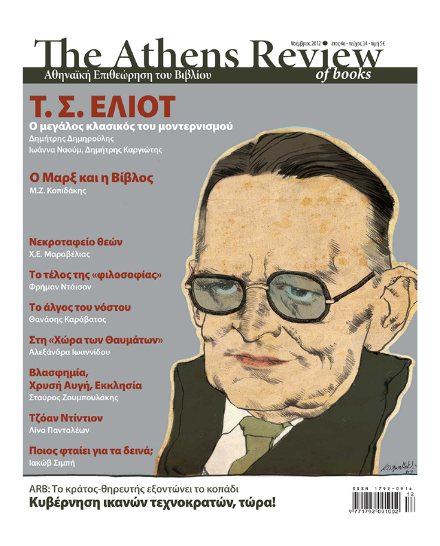 Το τεύχος Νοεμβρίου της Athens Review of Books (ARB) είναι αφιερωμένο στον μεγάλο κλασικό του μοντερνισμού Τ.Σ. Έλιοτ. Η Ιωάννα Ναούμ γράφει για τα «Τέσσερα Κουαρτέτα», ο Δημήτρης Καργιώτης για το ζήτημα του κλασικού και την παρέμβαση του Έλιοτ, ενώ ο Δημήτρης Δημηρούλης απαντά στο ερώτημα «Σεφέρης – Έλιοτ: παράλληλα ασύμπτωτοι ή συμπτωματικά παράλληλοι;».